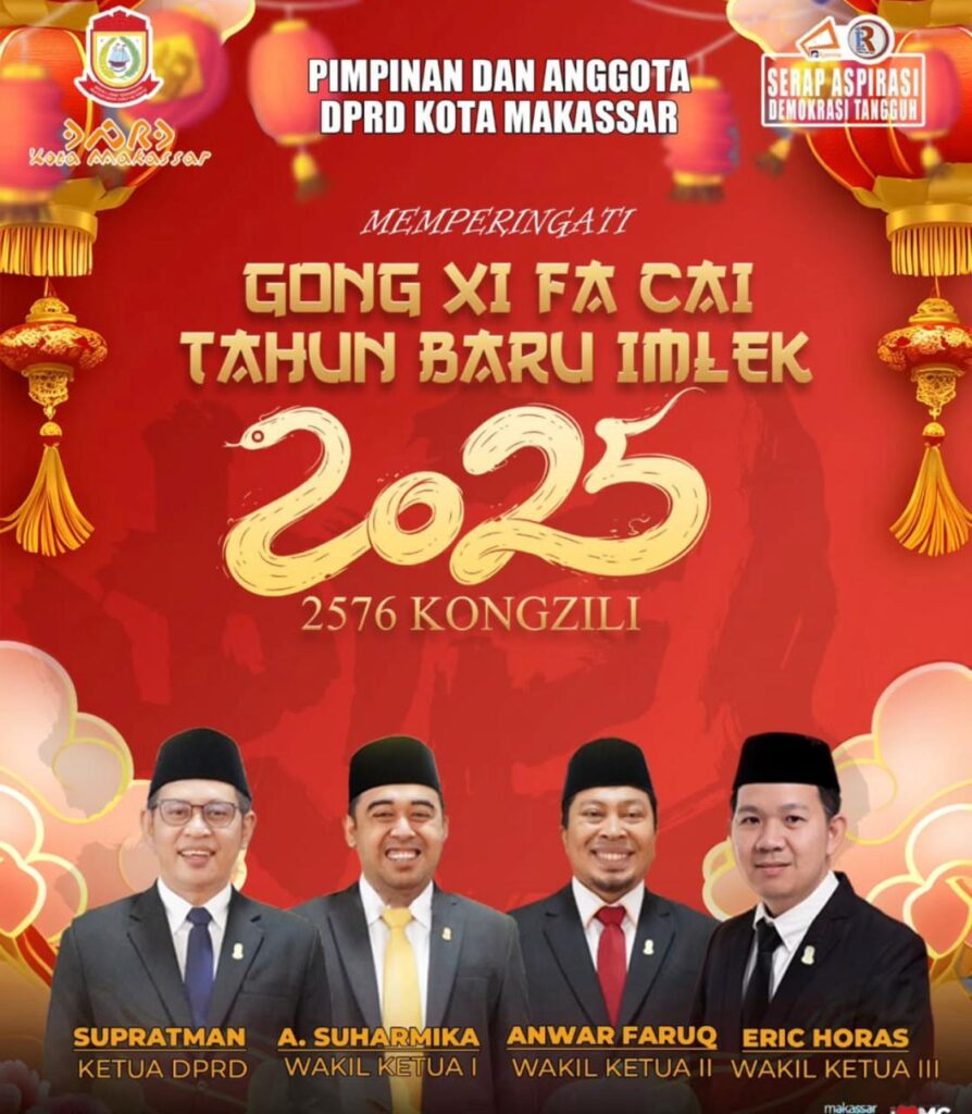 Makassar – Segenap Pimpinan dan Anggota Dewan Perwakilan Rakyat Daerah (DPRD) Kota Makassar mengucapkan selamat Tahun Baru Imlek 2025 yang akan diperingati oleh masyarakat Tionghoa pada 29 Januari 2025.